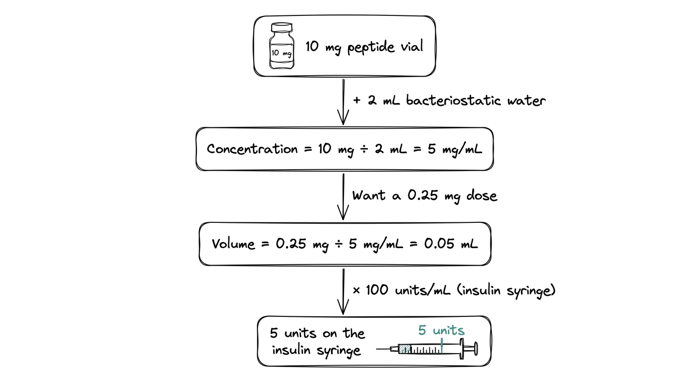 Two steps: first calculate concentration (peptide mg divided by water mL), then calculate dose volume (target dose mg divided by concentration). For insulin syringes, 1 mL equals 100 units. Example: 10 mg vial + 2 mL water = 5 mg/mL; for a 0.25 mg dose, draw 0.05 mL (5 units).