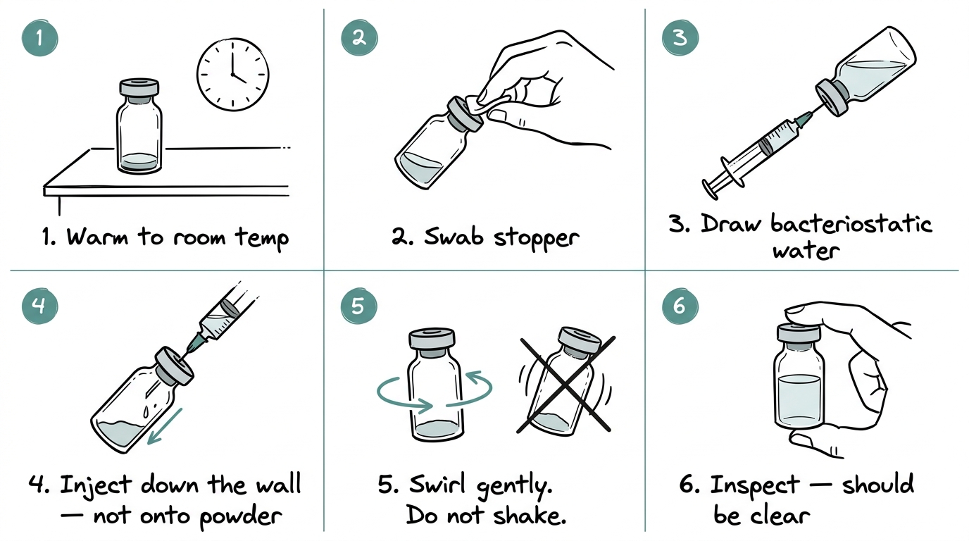 Warm the vial to room temperature, swab the stopper, draw bacteriostatic water into a syringe, inject slowly down the inside wall of the vial (not onto the powder), swirl gently without shaking, and inspect for a clear solution with no particulates.