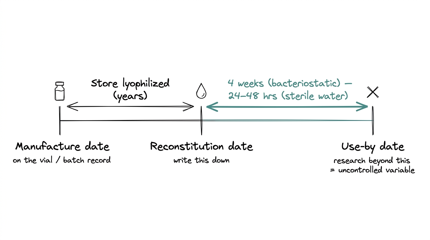 A vial that has been sitting reconstituted for six weeks is not the same vial it was at day one. Research using old solution is research with an extra uncontrolled variable.