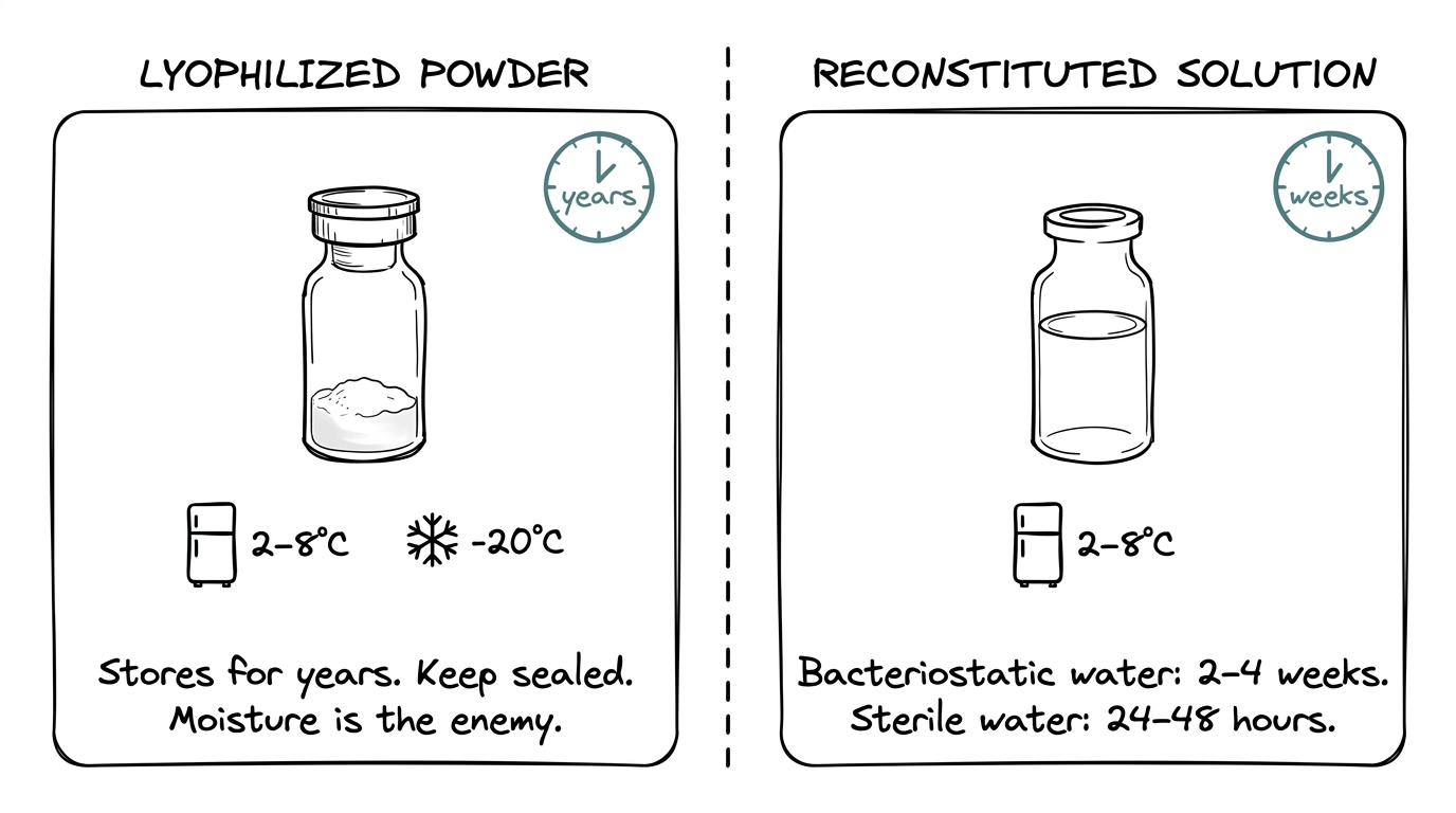 With bacteriostatic water, reconstituted peptides last 2-4 weeks refrigerated at 2-8 degrees C. With plain sterile water, only 24-48 hours. Lyophilized (powder) peptides stored sealed at 2-8 degrees C or colder can last years.