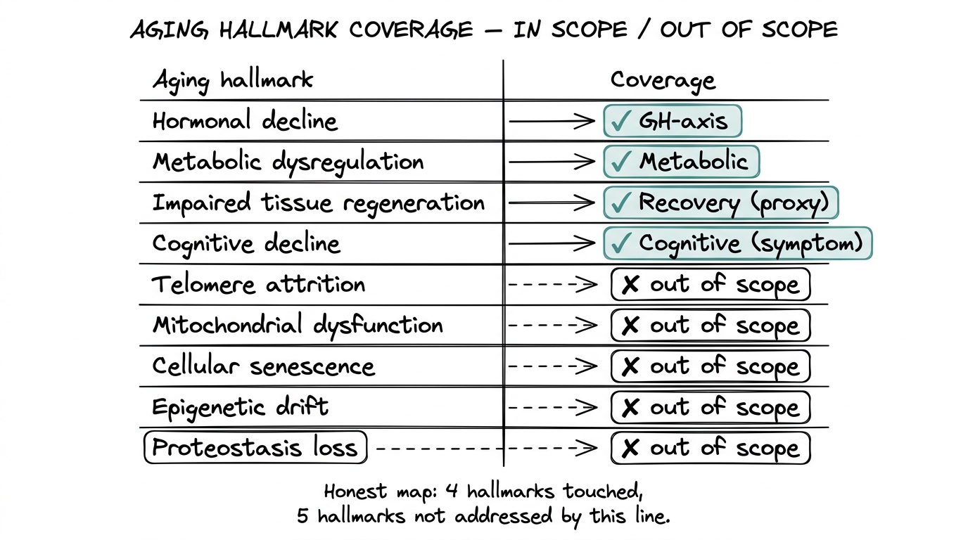 Any direct cellular-aging mechanism (telomere length, mitochondrial dysfunction, senescent-cell clearance). GH-axis work is upstream-hormonal, not cellular-rejuvenation.