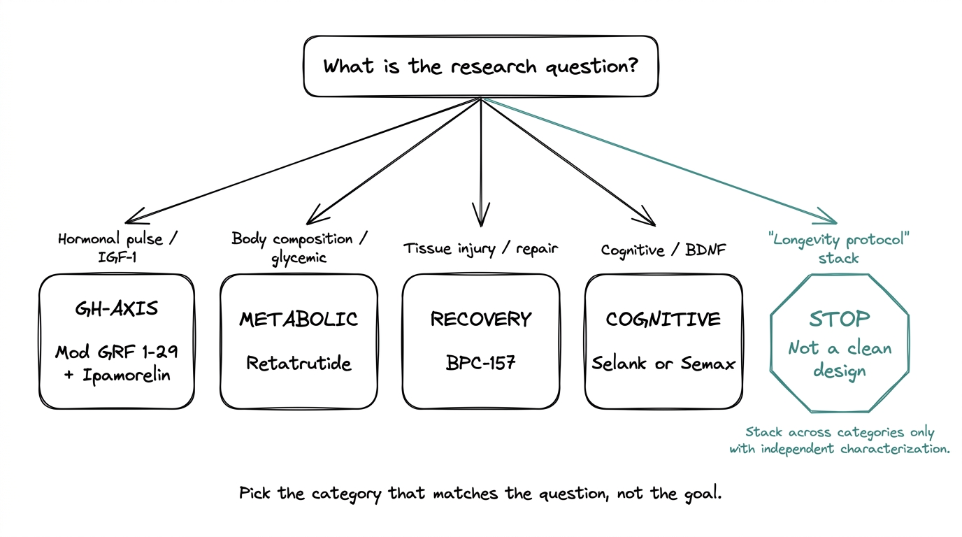 Stack across categories only when the experimental design can distinguish individual contributions. A GH-axis stack plus a recovery compound is a defensible research design when each variable is independently characterized. A four-category stack as a “longevity protocol” is not a clean research design and is not a framing this site supports.