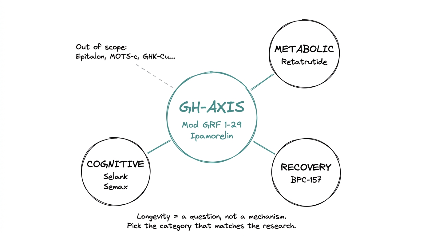 - ●Four research-peptide categories intersect the longevity conversation: GH-axis, metabolic, recovery, cognitive.
