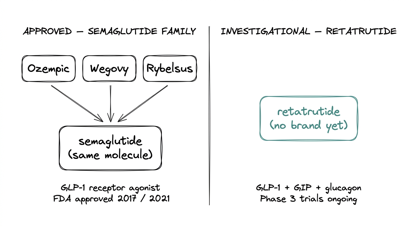 Ozempic is the brand name for semaglutide — a single-receptor GLP-1 agonist approved for type 2 diabetes and weight management. Retatrutide is an investigational triple agonist (GLP-1, GIP, and glucagon) currently in Phase 3. The comparison keeps coming up because retatrutide is the compound most often framed as “the next one after Ozempic.”