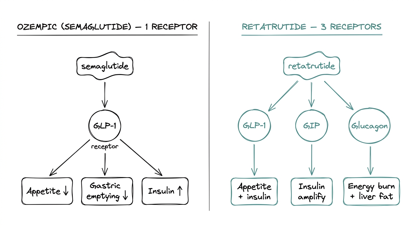 Three receptors, covering three metabolic levers at once: less food intake (GLP-1), enhanced insulin response (GLP-1 + GIP), and increased energy burn (glucagon).