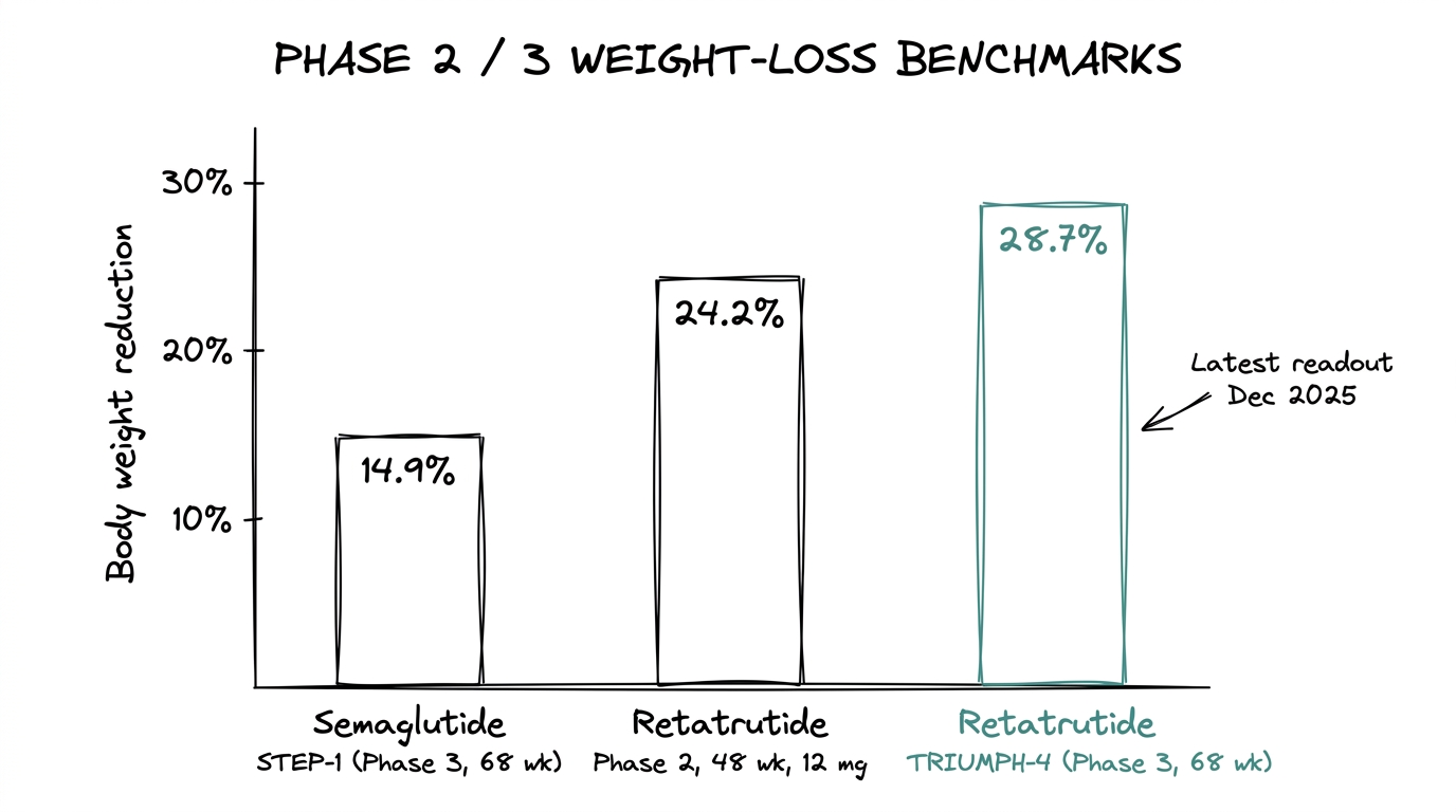 - ●The Phase 3 weight-reduction delta is ~14 percentage points: 14.9% for semaglutide vs 28.7% for retatrutide at matched 68-week timepoints.