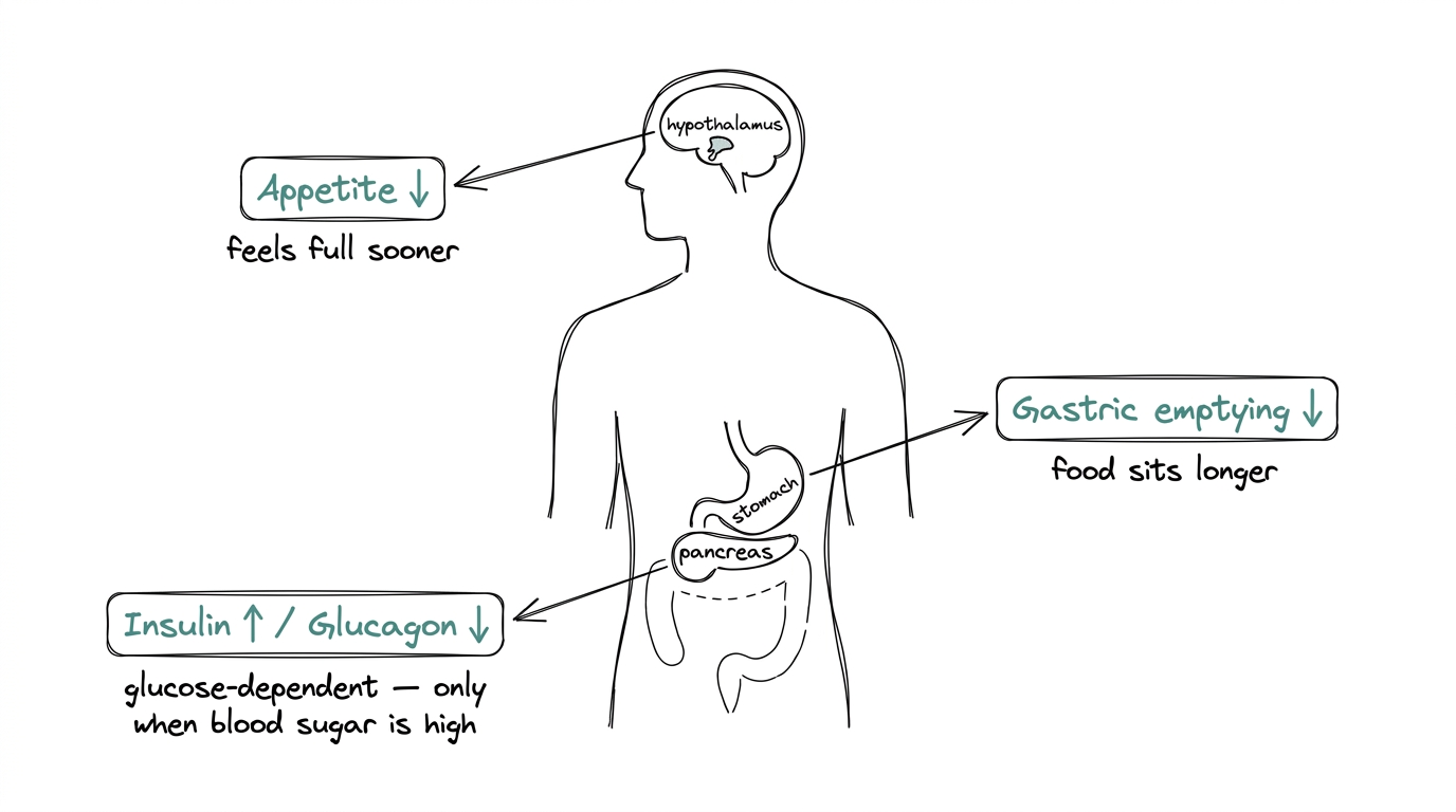 It stimulates insulin release in a glucose-dependent way, meaning it only kicks in when blood sugar is actually elevated, not all the time. It also suppresses glucagon, the hormone that raises blood sugar, which reduces unnecessary blood-sugar spikes.