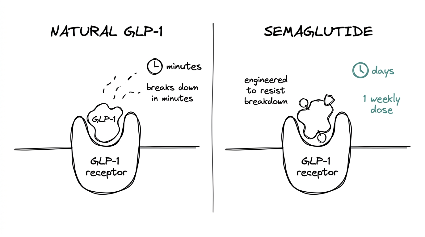 Natural GLP-1 breaks down within minutes. Semaglutide is engineered to resist that breakdown, which is why a single weekly injection can do what the body's own hormone does on a moment-to-moment basis.