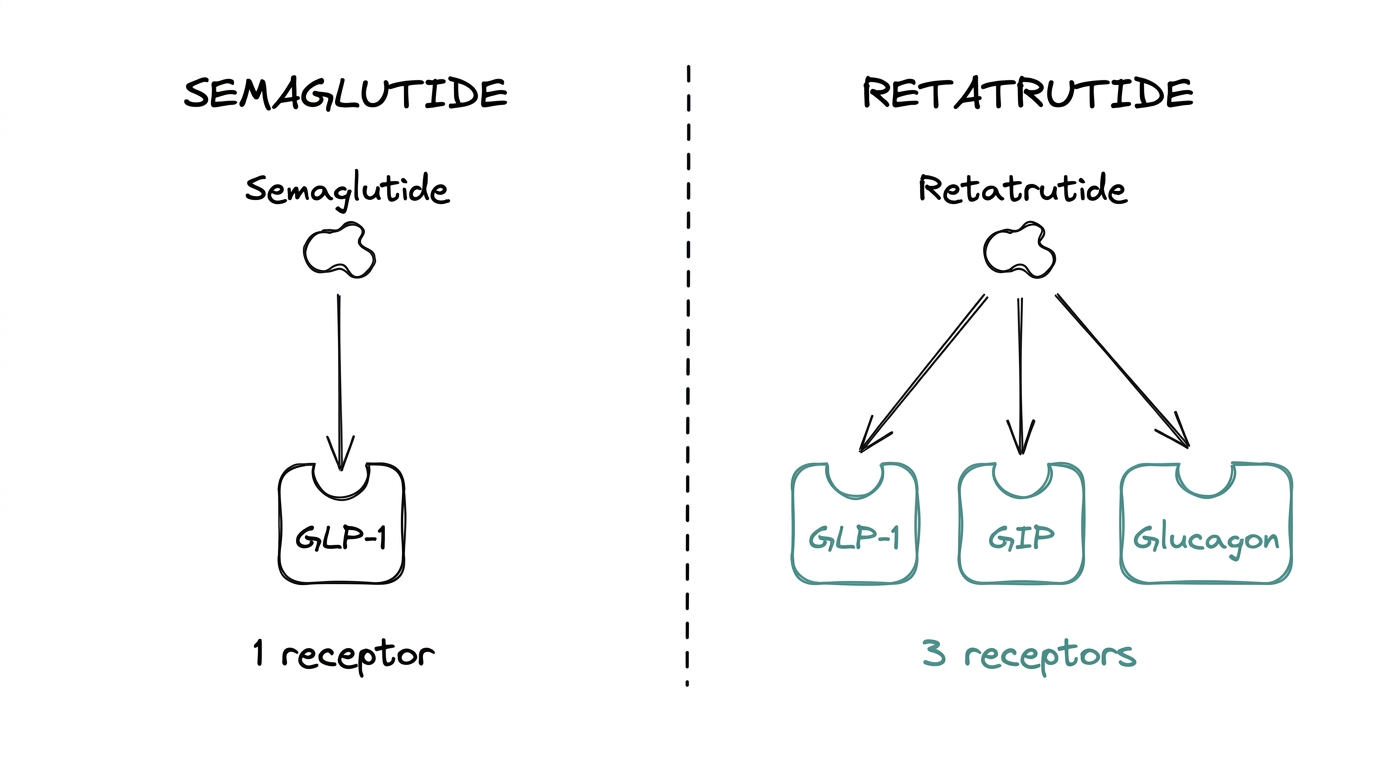 Semaglutide activates one receptor (GLP-1) and achieves roughly 15% weight reduction. Retatrutide activates three receptors (GLP-1, GIP, glucagon) and showed 24-29% weight reduction in trials. Semaglutide is approved; retatrutide is in Phase 3.